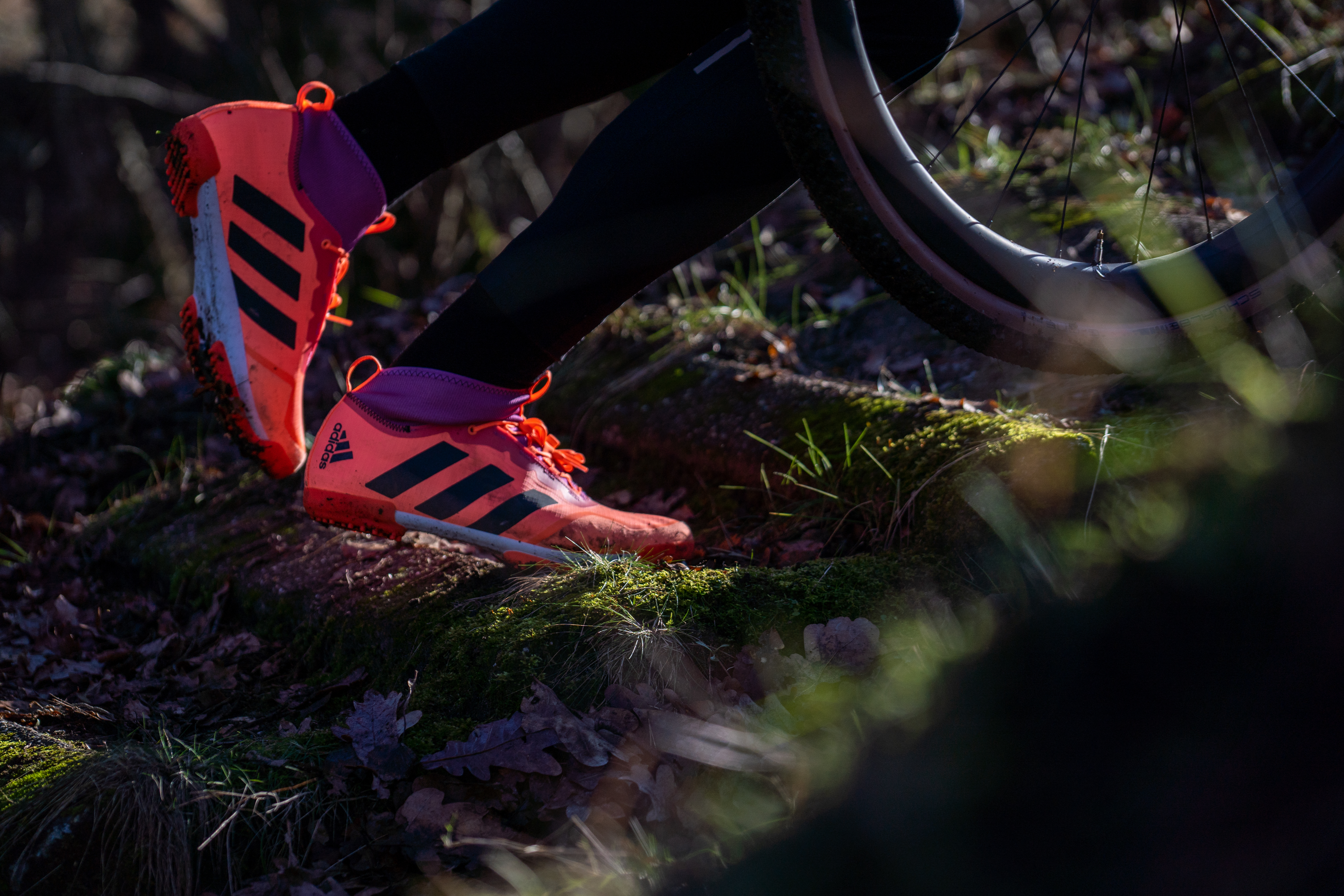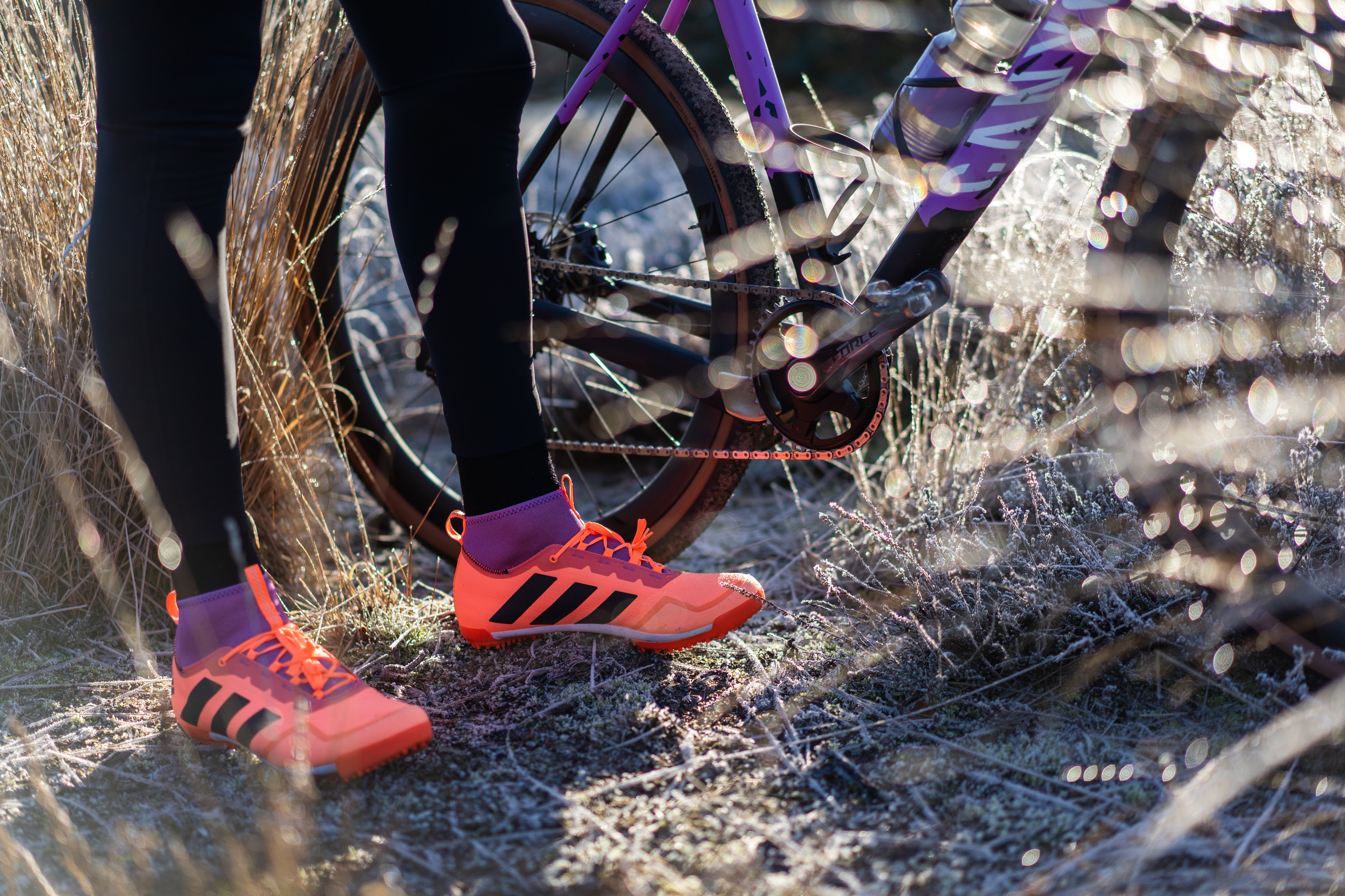 Firstly: the aesthetics are divisive. The first thing you might notice is the internal sock, commonly seen on football shoes but are now found on a number of gravel cycling shoes. You might hate or you might love it. Probably most cyclists choose the first option. Second: the color is indeed divisive as well, the Beam Orange / Core Black / Semi Pulse Lilac a unique color combination seen throughout other Adidas sports collections, it might not appeal to the most of us. You’ll have to bring your A-game to go matchy matchy with these shoes.